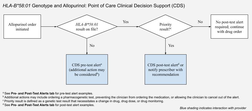 一項綜合分析計算了allopurinol誘導的SJS/TEN在HLA-B*5801攜帶者中的比值比為96.6,與allopurinol耐受的匹配對照相比,或與人群對照相比為79[Article:21906289]。美國風濕病學會(ACR)的指導方針建議僅篩查高風險人群(如3期慢性腎病的韓國人、漢族和泰國患者),並且那些被發現對HLA-B*5801陽性的人應該被處方替代藥物[Article:23024028]。藥物基因體學臨床應用聯盟(CPIC)的指導方針還建議不使用allopurinol於已知攜帶HLA-B*5801的患者[Article:23232549]。目前批准的FDA-藥物仿單對allopurinol的基因型沒有任何信息,儘管FDA的科學家發表了一項研究,評估allopurinol的臨床實用性,並報告了強烈建議和高度顯著的HLA-B*5801與allopurinol相關的可能性之間的關聯[Article:22118056]。