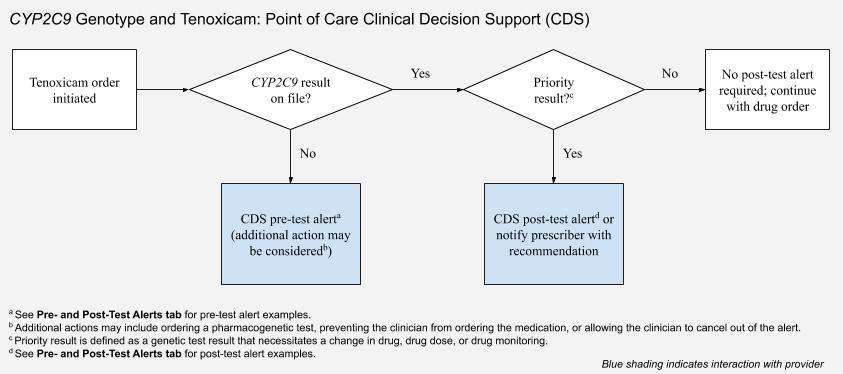 CPIC 對 tenoxicam 的劑量指引建議,CYP2C9 弱代謝型(Poor metabolizer)和中間代謝型(Intermediate metabolizer)活性分數為1的患者應選擇不經由 CYP2C9 代謝或不受 CYP2C9 基因變異顯著影響的替代療法,或者選擇經由 CYP2C9 代謝但半衰期較短的NSAID。詳情及支持證據請參閱完整指引。